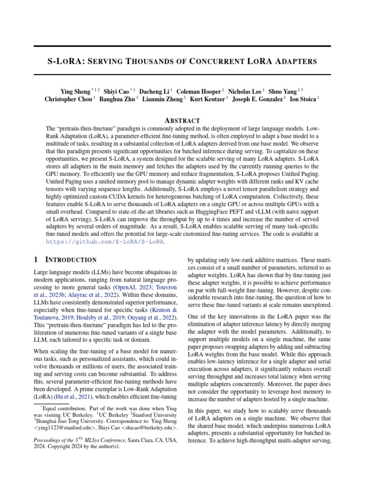 GPU memory. To efficiently use the GPU memory and reduce fragmentation, S-LoRA proposes Unified Paging.