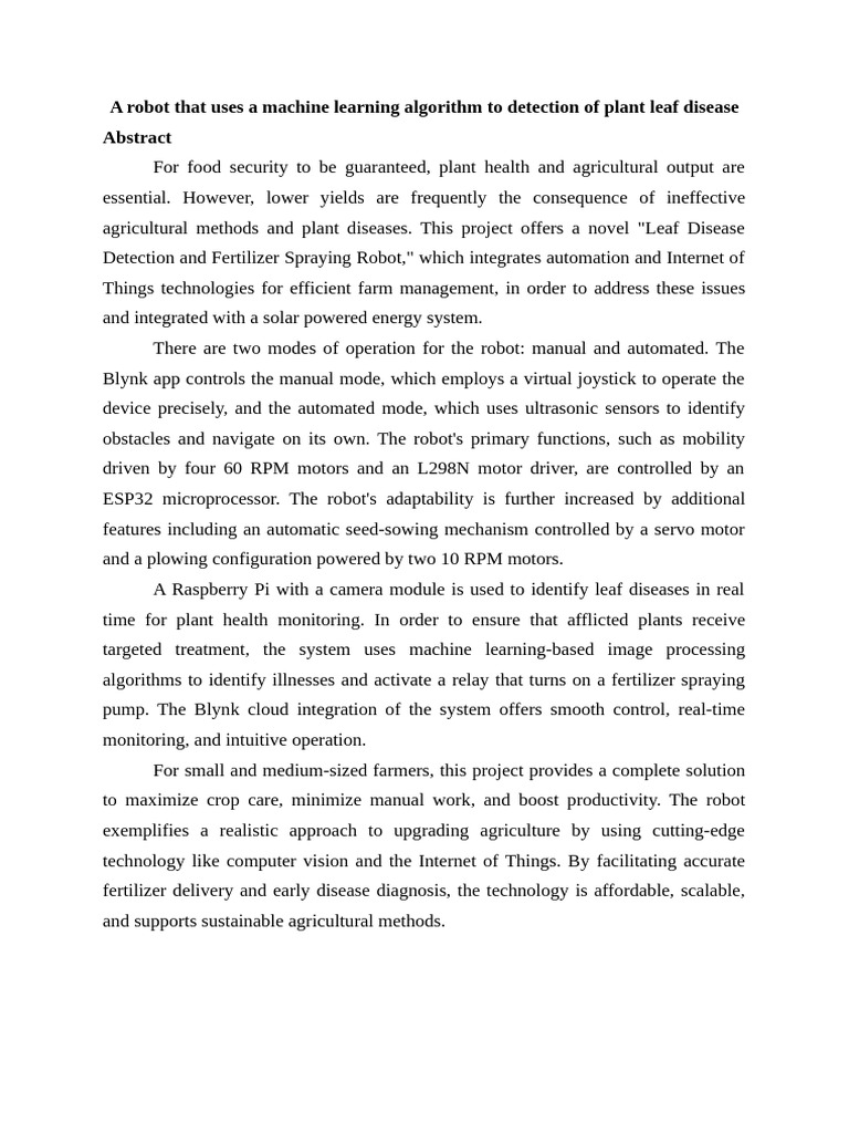labor, this project presents a Leaf Disease Detection and Fertilizer Spraying Robot.