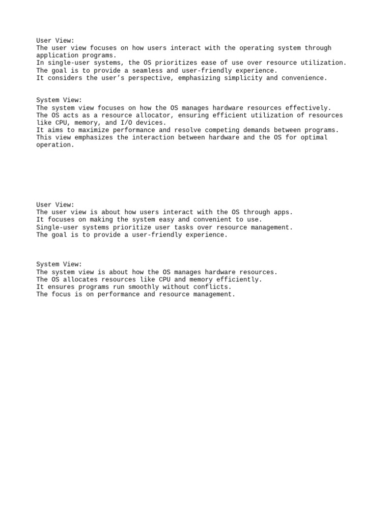 The system view focuses on how the OS manages hardware resources effectively.