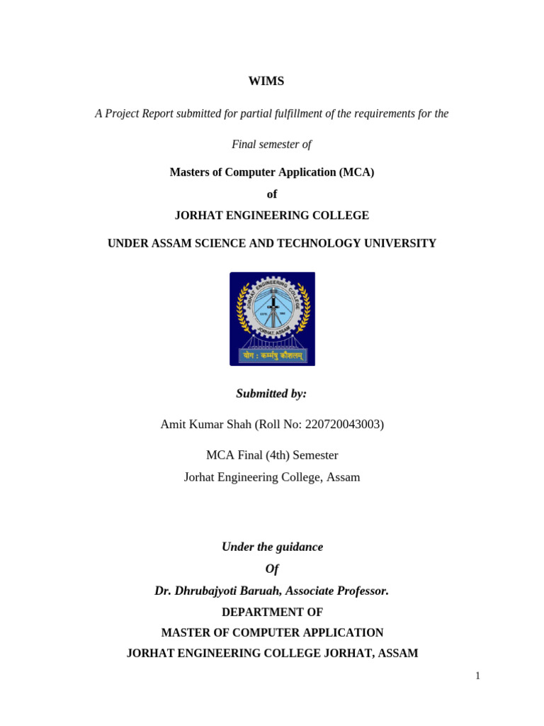 This is to certify that the project entitled “WIMS.” submitted by Amit Kumar