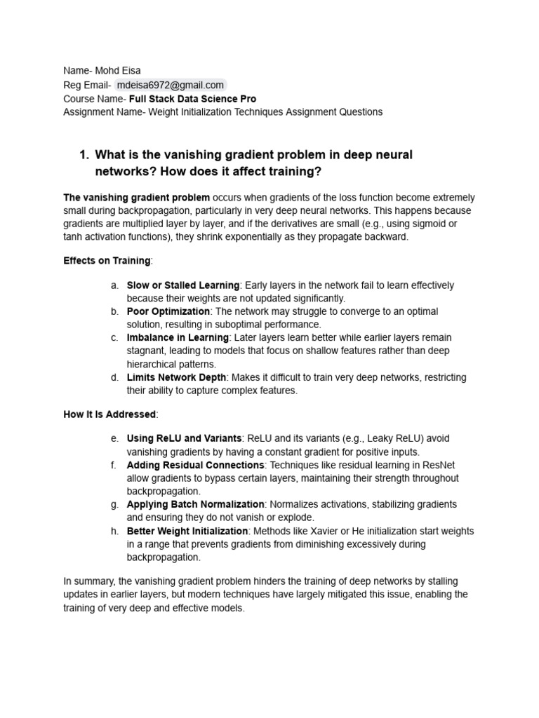 Assignment Name- Weight Initialization Techniques Assignment Questions