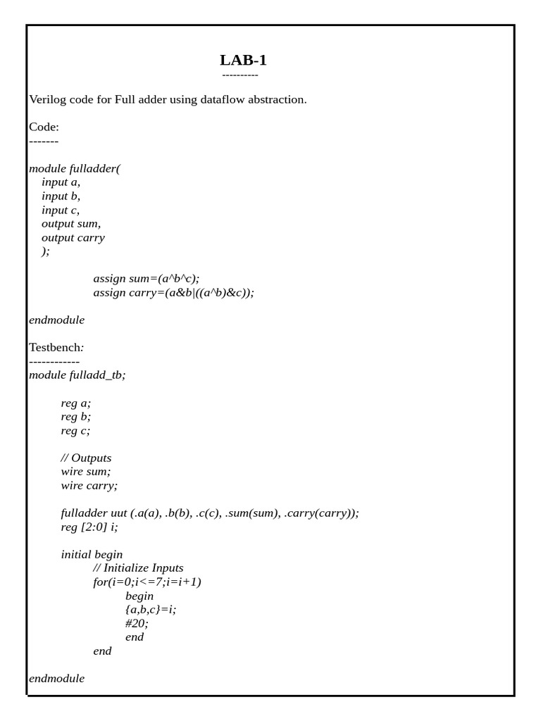 Verilog code for Full adder using dataflow abstraction.
