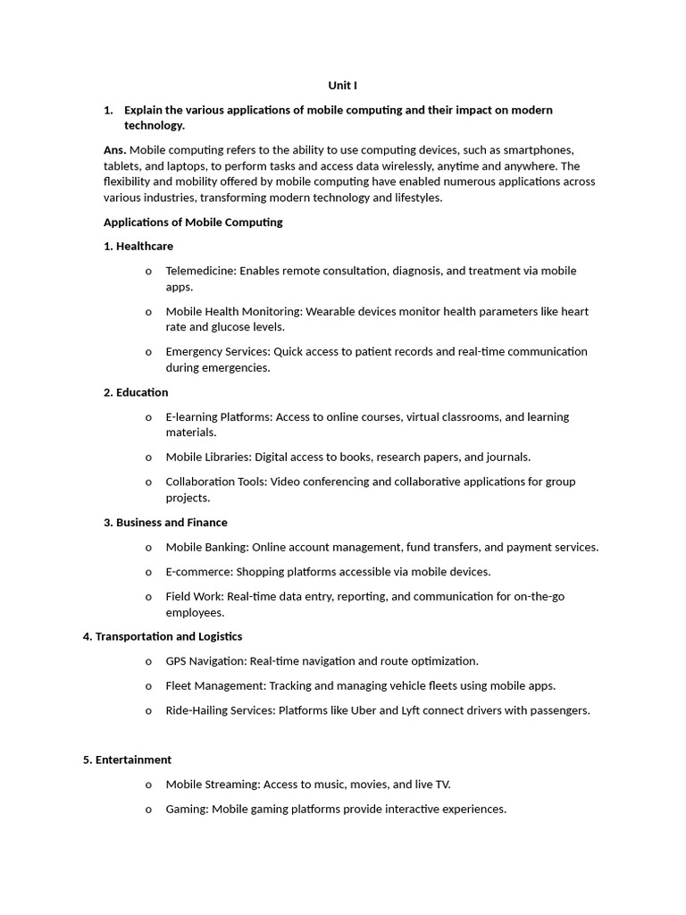 1. Explain the various applications of mobile computing and their impact on modern