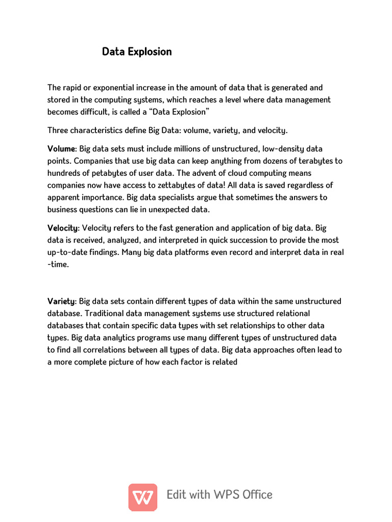 Velocity: Velocity refers to the fast generation and application of big data. Big