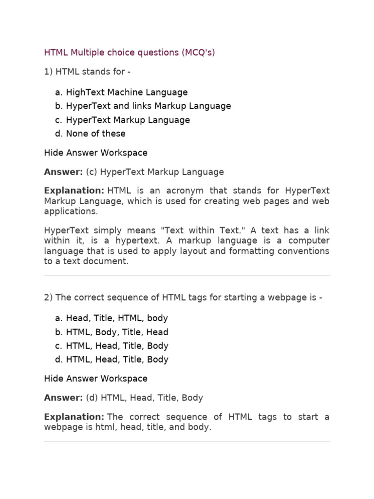 HTML Multiple choice questions (MCQ's)