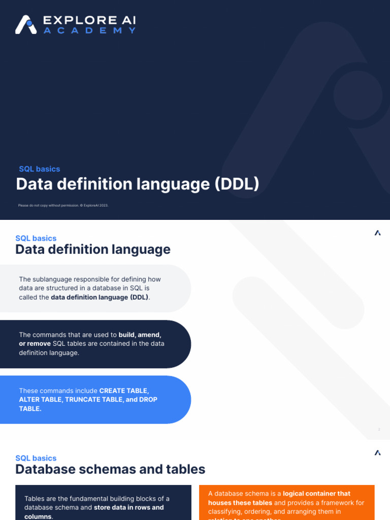 | The CREATE TABLE statement is used to create new tables. It specifies the structure of the