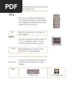 computations. Tower or Desktop The "box" or case that holds the parts that make up a computer: CPU, hard disk drive, floppy drive, memory chips, power supply, interface cards, etc. Click here to learn more. Central Processing Unit, or "brains" of the computer An output display device (looks similar to a TV) in a computer system. You see information on the monitor's screen. The viewing area on a monitor or the information or image displayed. A device that reads data from (input) or records data onto a disk for storage (output).