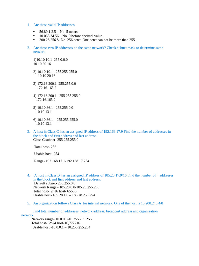 4. A host in Class B has an assigned IP address of 185.28.17.9/16 Find the number of addresses