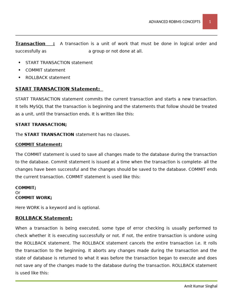 to the database. Commit statement is issued at a time when the transaction is complete- all the