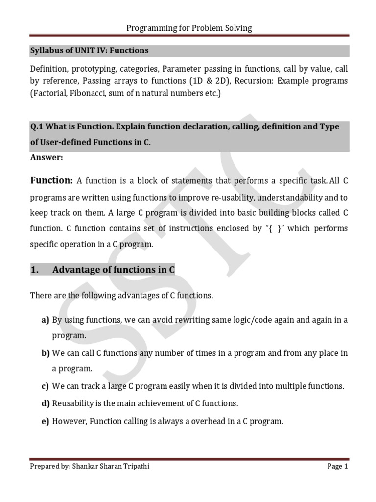 Q.1 What is Function. Explain function declaration, calling, definition and Type