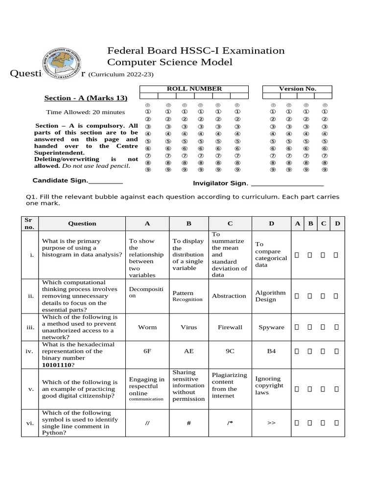 Q1. Fill the relevant bubble against each question according to curriculum. Each part carries
