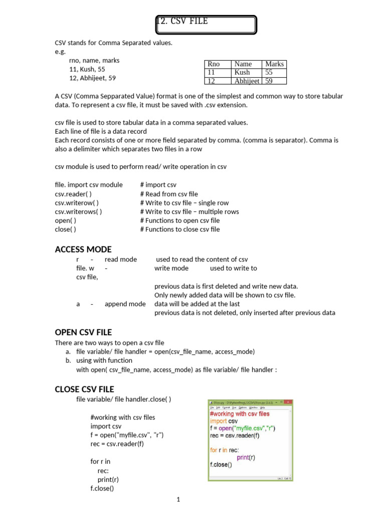 a. file variable/ file handler = open(csv_file_name, access_mode)