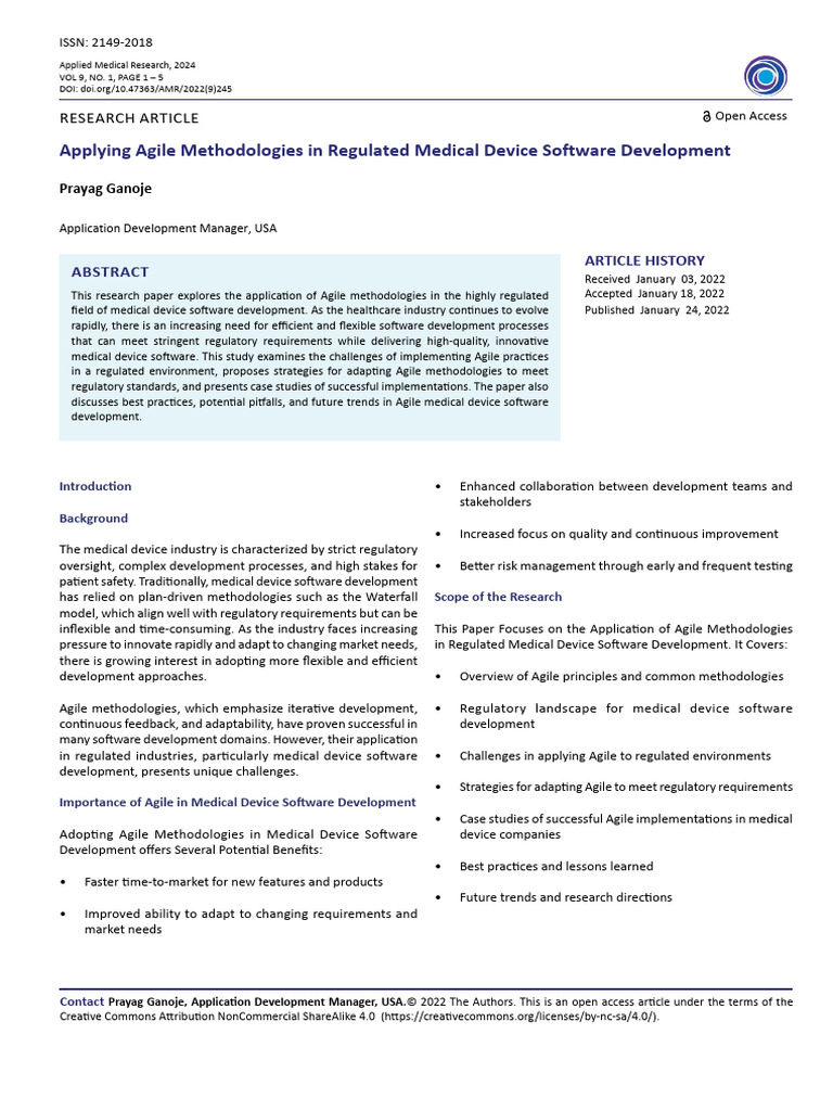 Citation: Prayag Ganoje (2022) Applying Agile Methodologies in Regulated Medical Device Software Development.