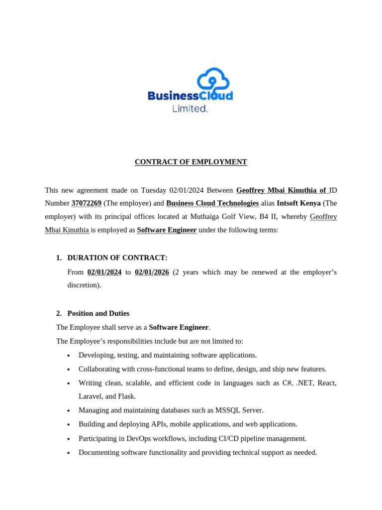 Mbai Kinuthia is employed as Software Engineer under the following terms: