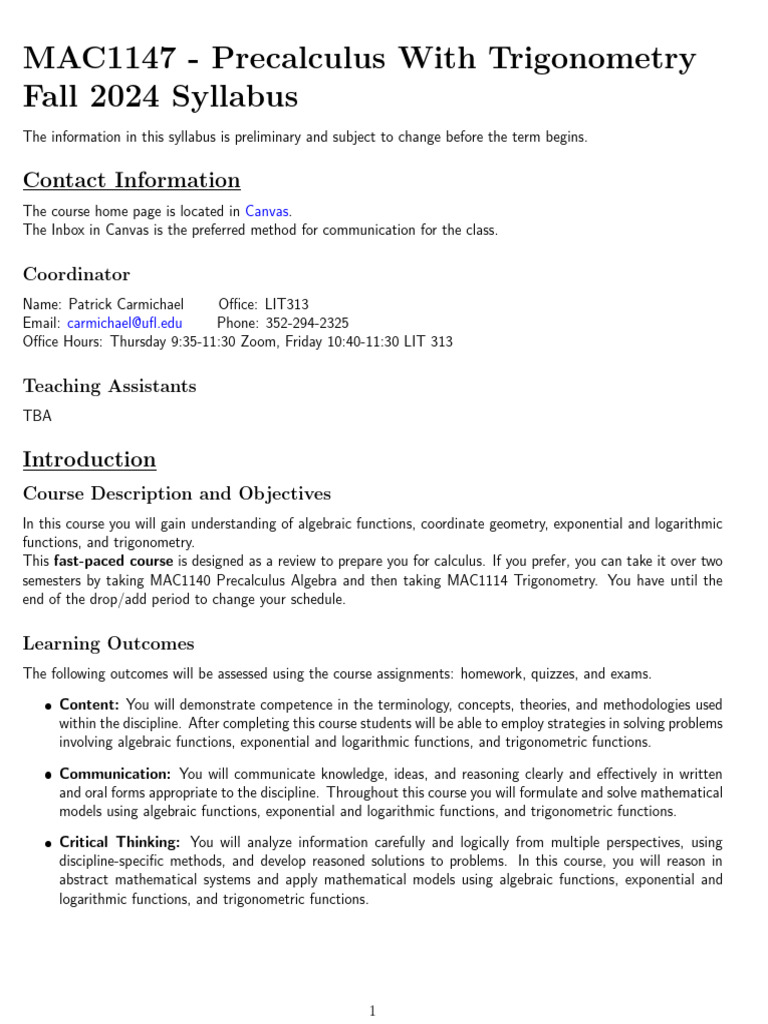 Success in MAC1147 comes from your e↵ort and attitude. Keeping up with the material is critical. Research