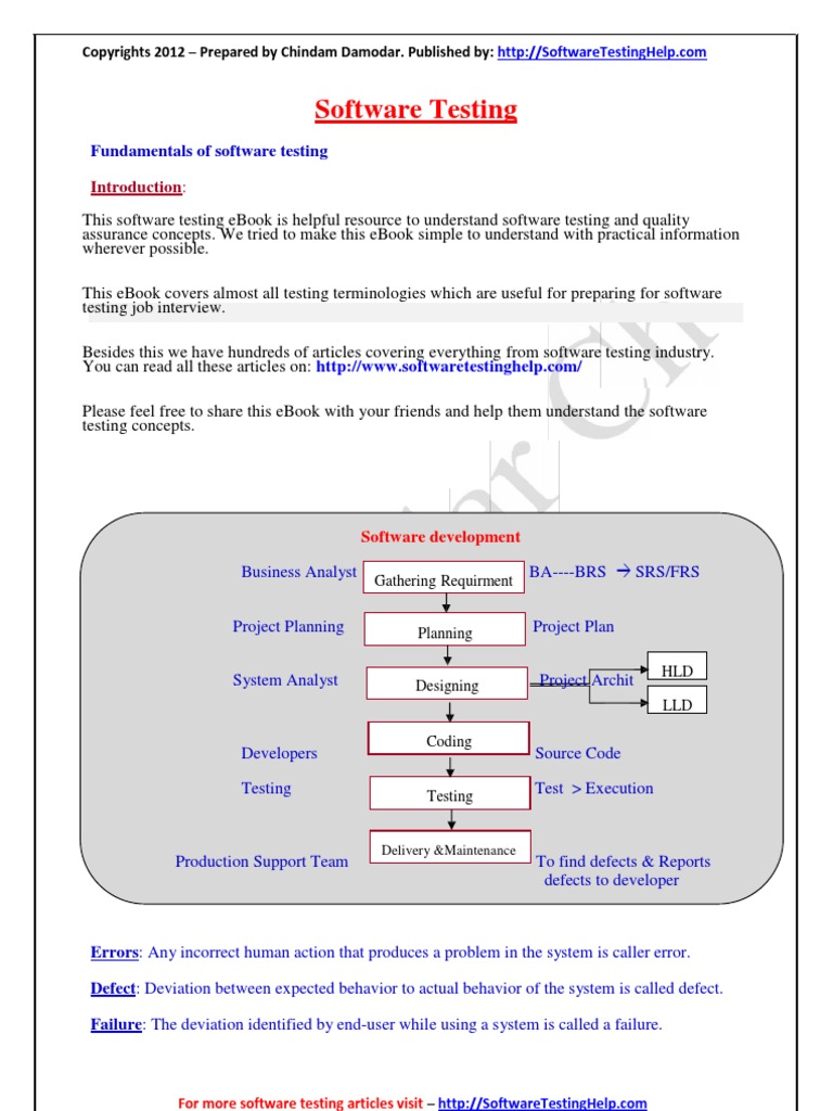 Fundamentals of software testing Introduction: This software testing eBook is helpful resource to understand software testing and quality assurance concepts. We tried to make this eBook simple to understand with practical information wherever possible. This eBook covers almost all testing terminologies which are useful for preparing for software testing job interview. Besides this we have hundreds of articles covering everything from software testing industry. You can read all these articles on: http://www.softwaretestinghelp.com/ Please feel free to share this eBook with your friends and help them understand the software testing concepts.