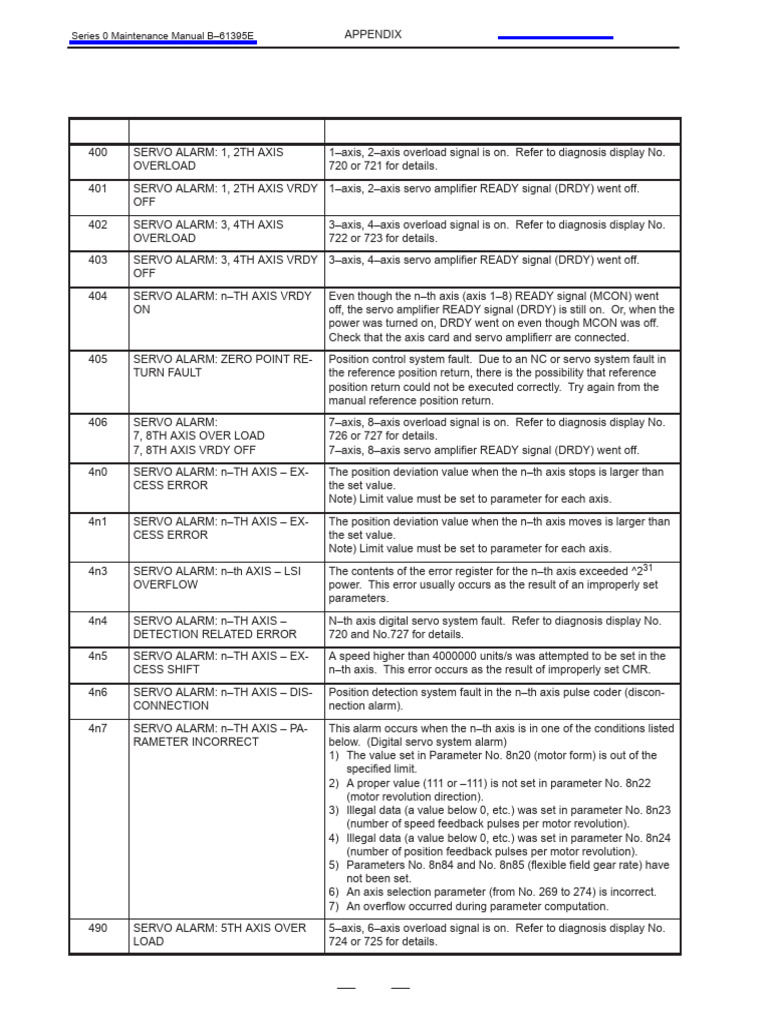 4n7 SERVO ALARM: n–TH AXIS – PA- This alarm occurs when the n–th axis is in one of the conditions listed