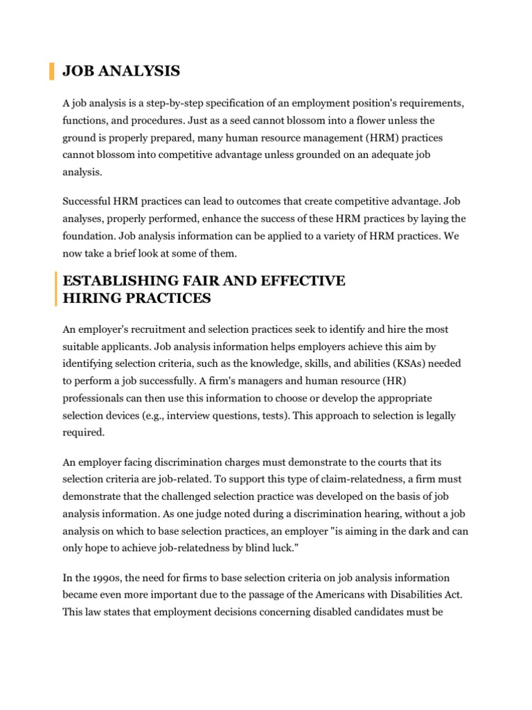 A job analysis is a step-by-step specification of an employment position's requirements, functions, and procedures. Just as a seed cannot blossom into a flower unless the ground is properly prepared, many human resource management (HRM) practices cannot blossom into competitive advantage unless grounded on an adequate job analysis. Successful HRM practices can lead to outcomes that create competitive advantage. Job analyses, properly performed, enhance the success of these HRM practices by laying the foundation. Job analysis information can be applied to a variety of HRM practices. We now take a brief look at some of them.