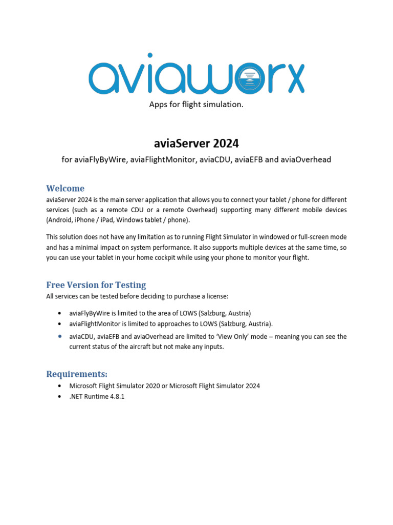 for aviaFlyByWire, aviaFlightMonitor, aviaCDU, aviaEFB and aviaOverhead