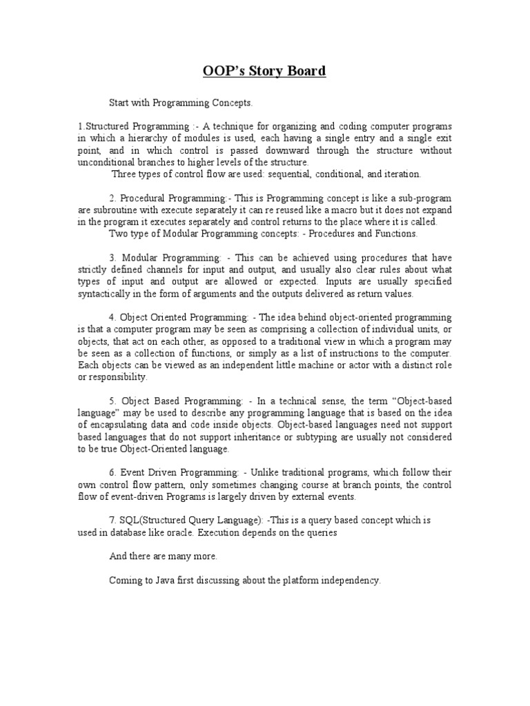 Start with Programming Concepts. 1.Structured Programming :- A technique for organizing and coding computer programs in which a hierarchy of modules is used, each having a single entry and a single exit point, and in which control is passed downward through the structure without unconditional branches to higher levels of the structure. Three types of control flow are used: sequential, conditional, and iteration. 2. Procedural Programming:- This is Programming concept is like a sub-program are subroutine with execute separately it can re reused like a macro but it does not expand in the program it executes separately and control returns to the place where it is called. Two type of Modular Programming concepts: - Procedures and Functions. 3. Modular Programming: - This can be achieved using procedures that have strictly defined channels for input and output, and usually also clear rules about what types of input and output are allowed or expected. Inputs are usually specified syntactically in the form of arguments and the outputs delivered as return values. 4. Object Oriented Programming: - The idea behind object-oriented programming is that a computer program may be seen as comprising a collection of individual units, or objects, that act on each other, as opposed to a traditional view in which a program may be seen as a collection of functions, or simply as a list of instructions to the computer. Each objects can be viewed as an independent little machine or actor with a distinct role or responsibility. 5. Object Based Programming: - In a technical sense, the term Object-based language may be used to describe any programming language that is based on the idea of encapsulating data and code inside objects. Object-based languages need not support based languages that do not support inheritance or subtyping are usually not considered to be true Object-Oriented language. 6. Event Driven Programming: - Unlike traditional programs, which follow their own control flow pattern, only sometimes changing course at branch points, the control flow of event-driven Programs is largely driven by external events. 7. SQL(Structured Query Language): -This is a query based concept which is used in database like oracle. Execution depends on the queries And there are many more. Coming to Java first discussing about the platform independency.