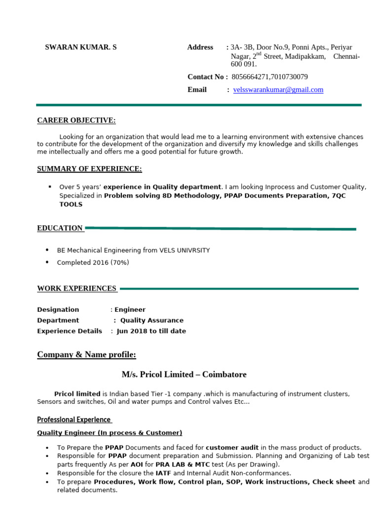 SWARAN KUMAR. S Address : 3A- 3B, Door No.9, Ponni Apts.
