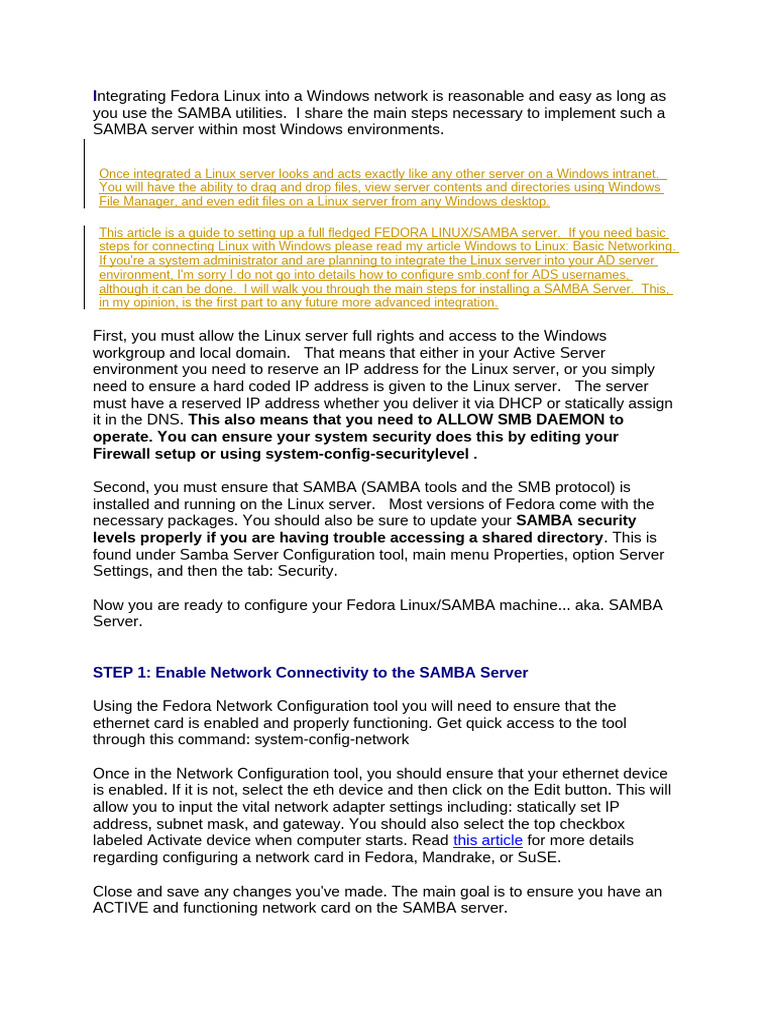 This article is a guide to setting up a full fledged FEDORA LINUX/SAMBA server. If you need basic