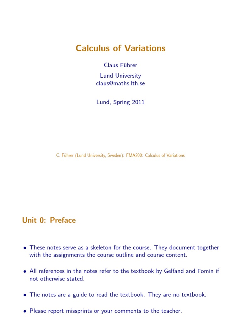 C. Fhrer (Lund University, Sweden): FMA200: Calculus of Variations u 2