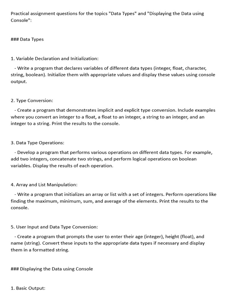 Practical assignment questions for the topics "Data Types" and "Displaying the Data using
