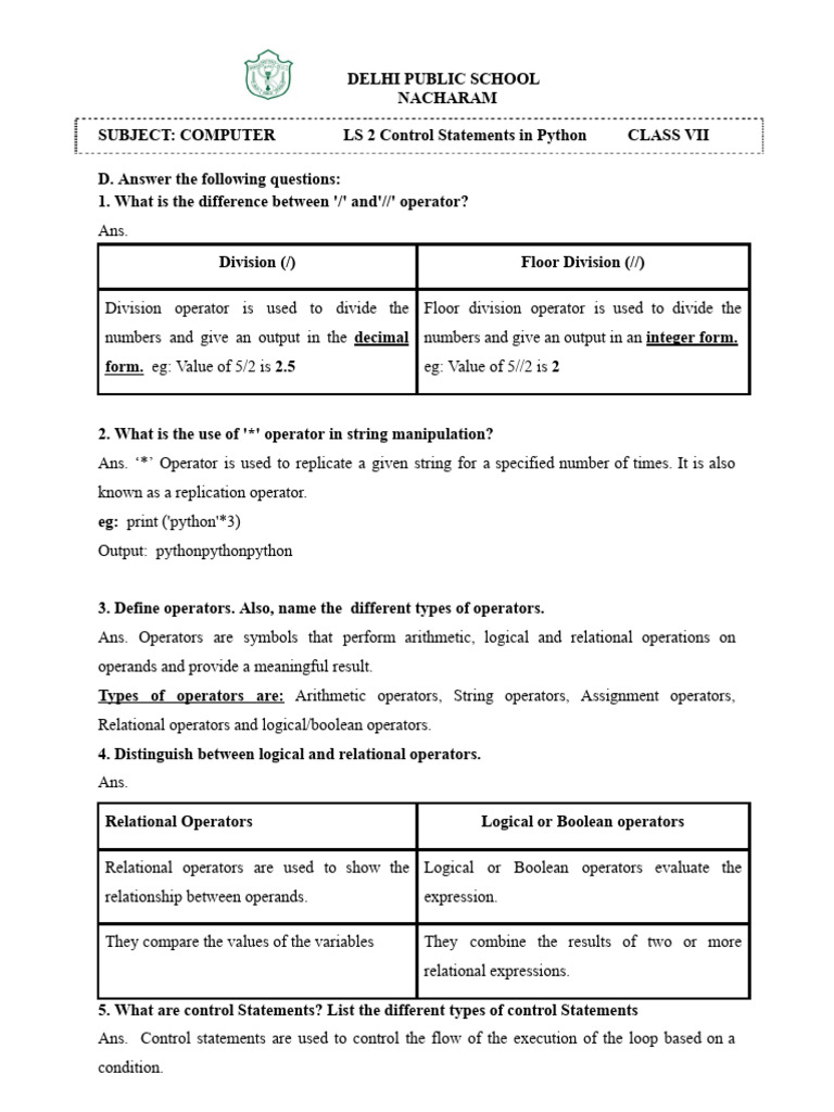 SUBJECT: COMPUTER LS 2 Control Statements in Python CLASS VII
