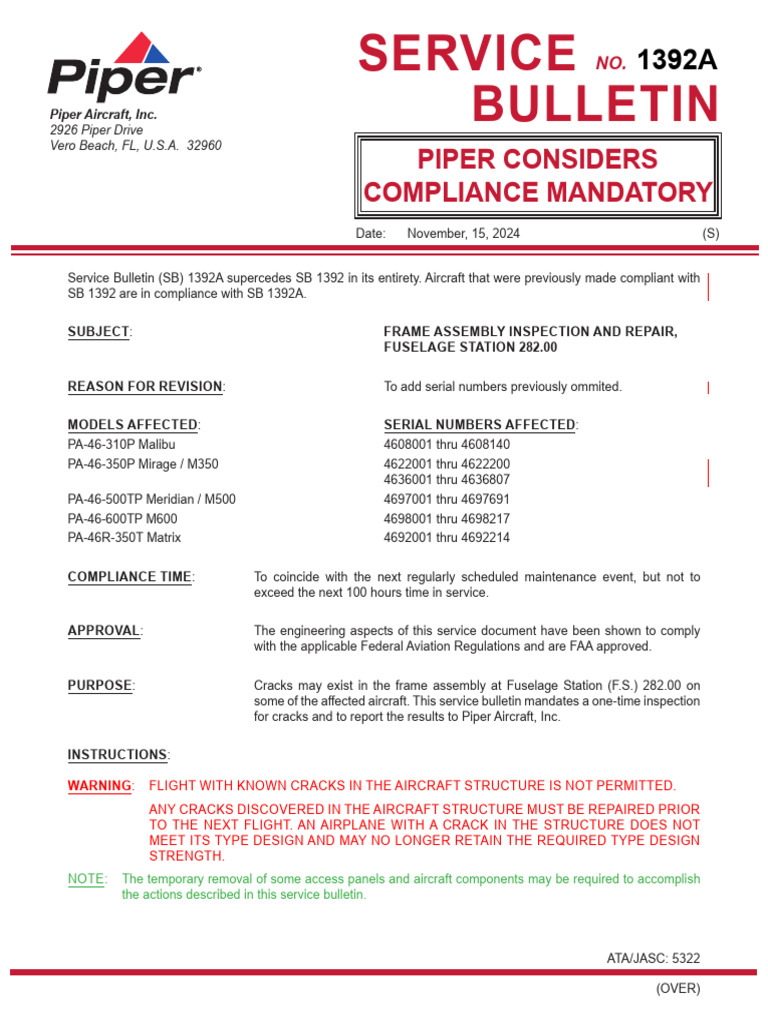 Service Bulletin (SB) 1392A supercedes SB 1392 in its entirety. Aircraft that were previously made compliant with