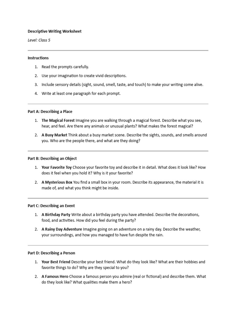 1. The Magical Forest Imagine you are walking through a magical forest. Describe what you see,