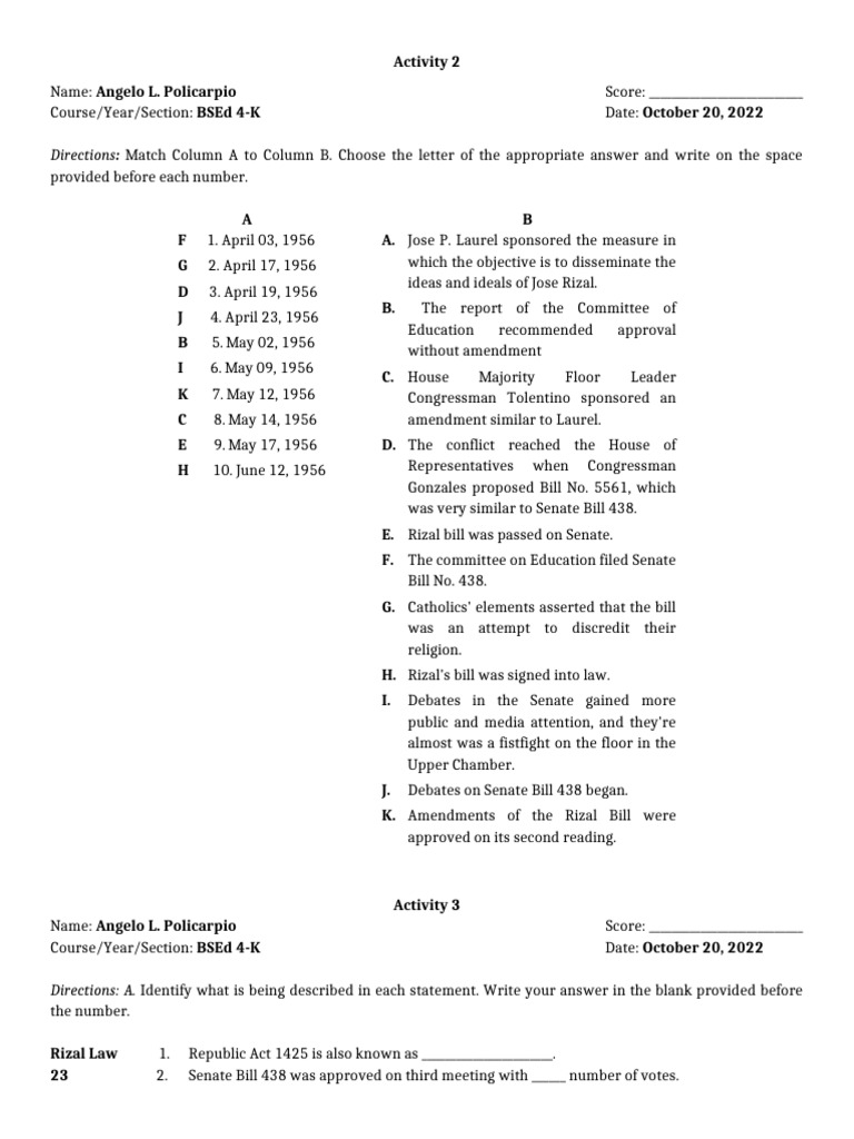 Course/Year/Section: BSEd 4-K Date: October 20, 2022