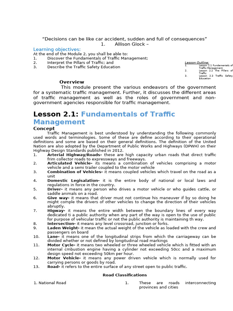2. Interpret the Pillars of Traffic; and Lesson Outline: