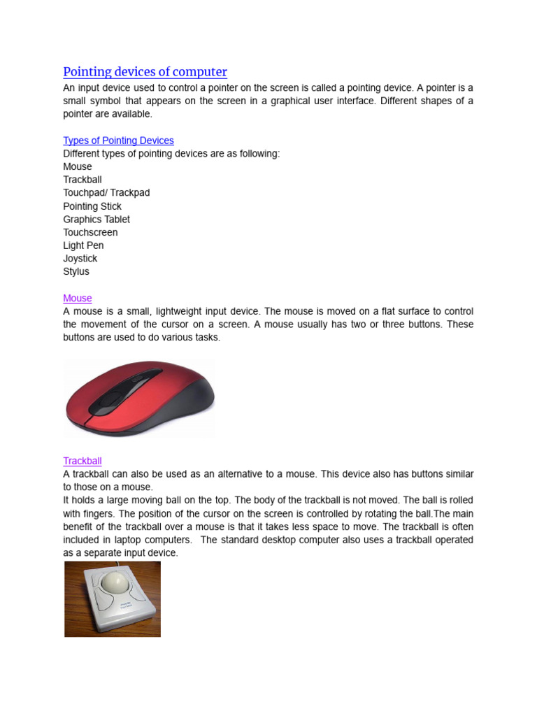 An input device used to control a pointer on the screen is called a pointing device. A pointer is a
