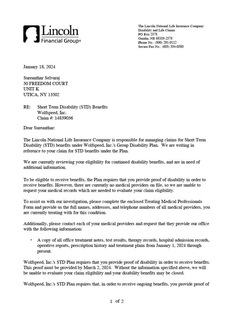 Disability (STD) benefits under Wolfspeed, Inc.'s Group Disability Plan. We are writing in