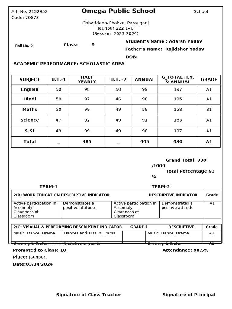 2(C) VISAUAL & PERFORMINGDESCRIPTIVE INDICATOR GRADE 1 DESCRIPTIVE Grade