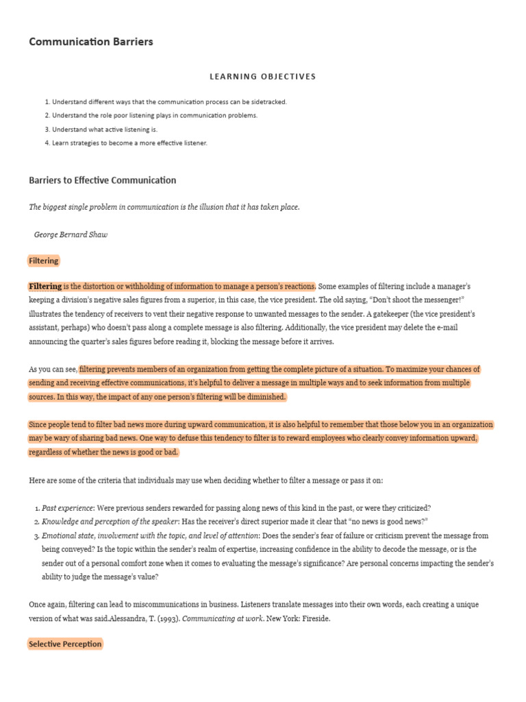 Many barriers to effec ve communica on exist. Examples include filtering, selec ve percep on, informa on overload, emo onal disconnects, lack of