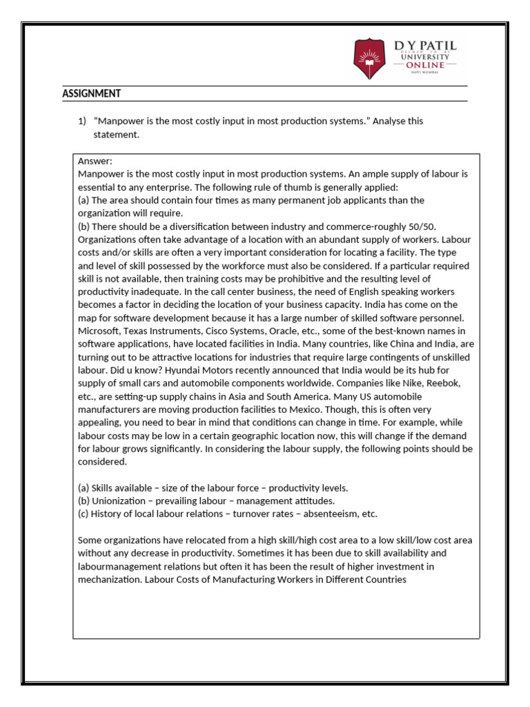 1) “Manpower is the most costly input in most production systems.” Analyse this