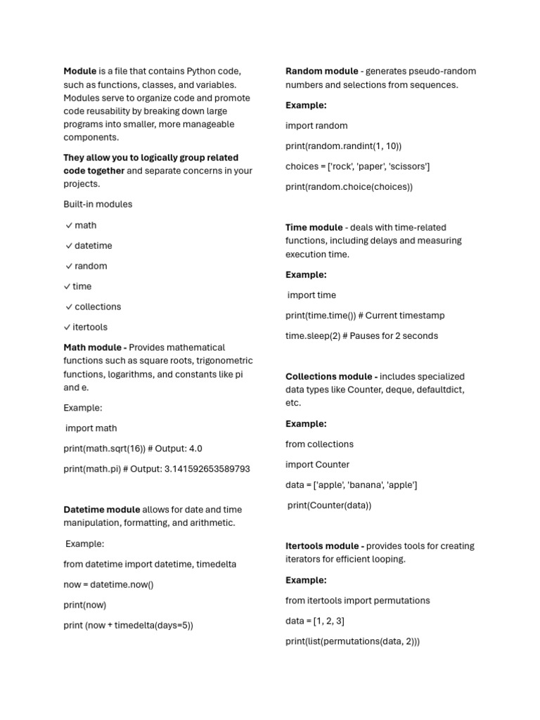 Module is a file that contains Python code, Random module - generates pseudo-random