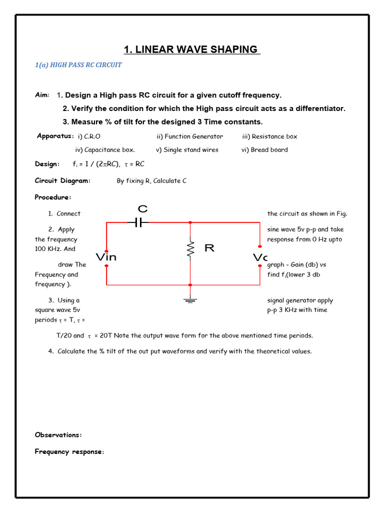 Aim: 1. Design a High pass RC circuit for a given cutoff frequency.