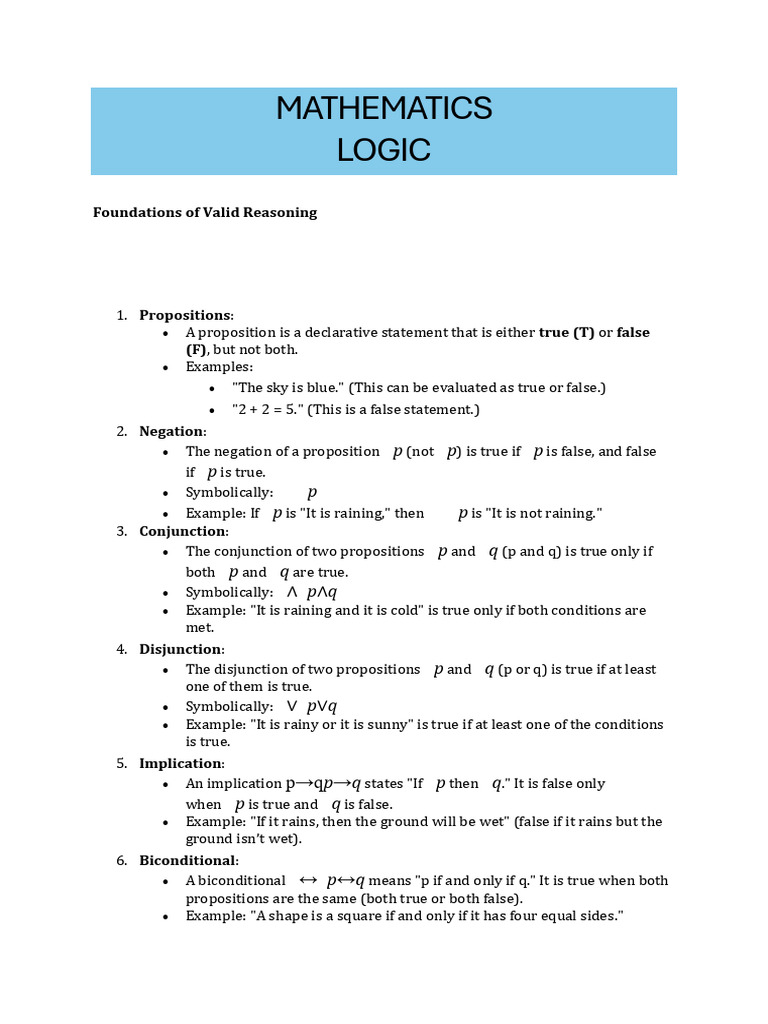 • The negation of a proposition pp (not pp) is true if pp is false, and false