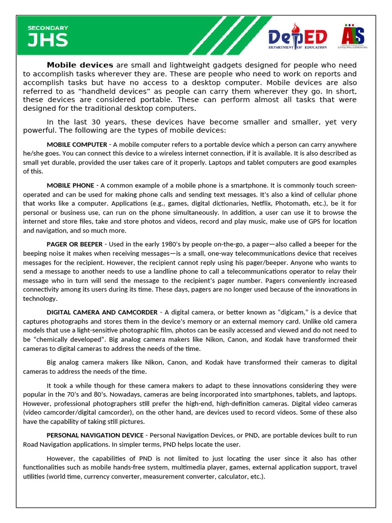 Learning Competencies: explain the meaning of “mobile device”; distinguish the characteristics of mobile
