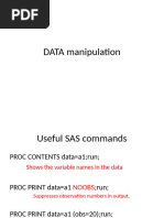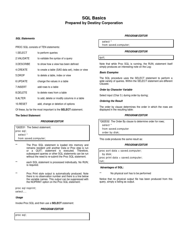 PROC SQL consists of TEN statements: 1.SELECT 2.VALIDATE 3.DESCRIBE 4.CREATE 5.DROP 6.UPDATE 7.INSERT 8.DELETE 9.ALTER 10.RESET to perform queries to validate the syntax of a query to show how a view has been defined to create a table (SAS data set), index or view quit; Note that while Proc SQL is running, the RUN; statement itself simply produces an interesting note on the Log: select * from saved.computer;