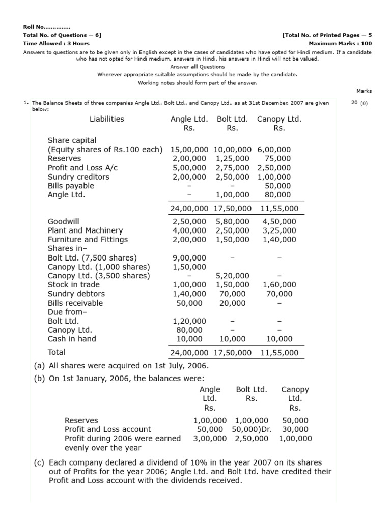 1. The Balance Sheets of three companies Angle Ltd., Bolt Ltd., and Canopy Ltd., as at 31st December, 2007 are given 20 (0)