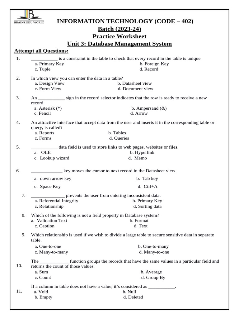 1. ___________ is a constraint in the table to check that every record in the table is unique.