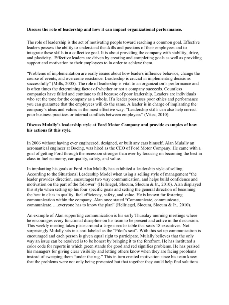 The role of leadership is the act of motivating people toward reaching a common goal. Effective leaders possess the ability to understand the skills and passions of their employees and to integrate these skills in a collective goal. It is about providing the company with stability, drive, and plasticity. Effective leaders are driven by creating and completing goals as well as providing support and motivation to their employees to in order to achieve them. Problems of implementation are really issues about how leaders influence behavior, change the course of events, and overcome resistance. Leadership is crucial in implementing decisions successfully (Mills, 2005). The role of leadership is vital to an organizations performance and is often times the determining factor of whether or not a company succeeds. Countless companies have failed and continue to fail because of poor leadership. Leaders are individuals who set the tone for the company as a whole. If a leader possesses poor ethics and performance you can guarantee that the employees will do the same. A leader is in charge of implanting the companys ideas and values in the most effective way. Leadership skills can also help correct poor business practices or internal conflicts between employees (Vitez, 2010). Discuss Mulallys leadership style at Ford Motor Company and provide examples of how his actions fit this style. In 2006 without having ever engineered, designed, or built any cars himself, Alan Mulally an aeronautical engineer at Boeing, was hired as the CEO of Ford Motor Company. He came with a goal of getting Ford through the recession stronger than ever by focusing on becoming the best in class in fuel economy, car quality, safety, and value. In implanting his goals at Ford Alan Mulally has exhibited a leadership style of selling. According to the Situational Leadership Model when using a selling style of management the leader provides direction, encourages two way communication, and helps build confidence and motivation on the part of the follower (Hellriegel, Slocum, Slocum & Jr., 2010). Alan displayed this style when setting up his four specific goals and setting the general direction of becoming the best in class in quality, fuel efficiency, safety, and value. He is known for fostering communication within the company. Alan once stated Communicate, communicate, communicate..everyone has to know the plan (Hellriegel, Slocum, Slocum & Jr., 2010). An example of Alan supporting communication is his early Thursday morning meetings where he encourages every functional discipline on his team to be present and active in the discussion. This weekly meeting takes place around a large circular table that seats 18 executives. Not surprisingly Mulally sits in a seat labeled as the Pilots seat. With this set up communication is encouraged and each person is given equal right to participate. Mulally believes that the only way an issue can be resolved is to be honest by bringing it to the forefront. He has instituted a color code for reports in which green stands for good and red signifies problems. He has praised his managers for giving clear visibility and letting others know when they are facing problems instead of sweeping them under the rug. This in turn created motivation since his team knew that the problems were not only being presented but that together they could help find solutions.
