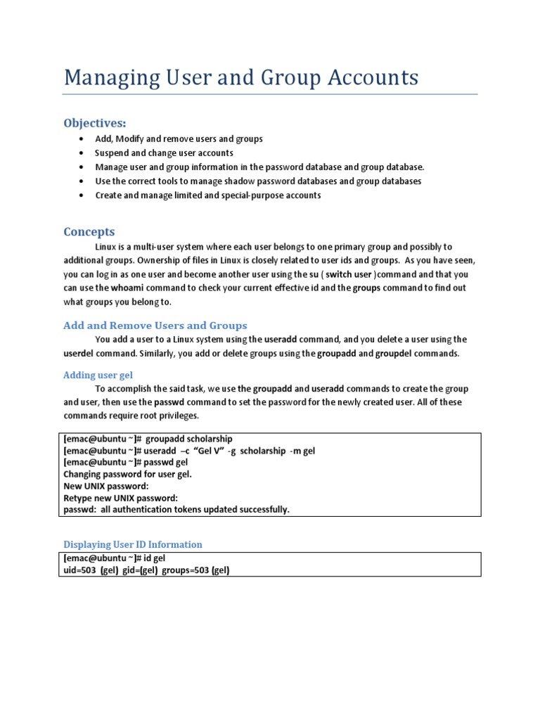 Displaying User ID Information [emac@ubuntu ~]# id gel uid=503 (gel) gid=(gel) groups=503 (gel)