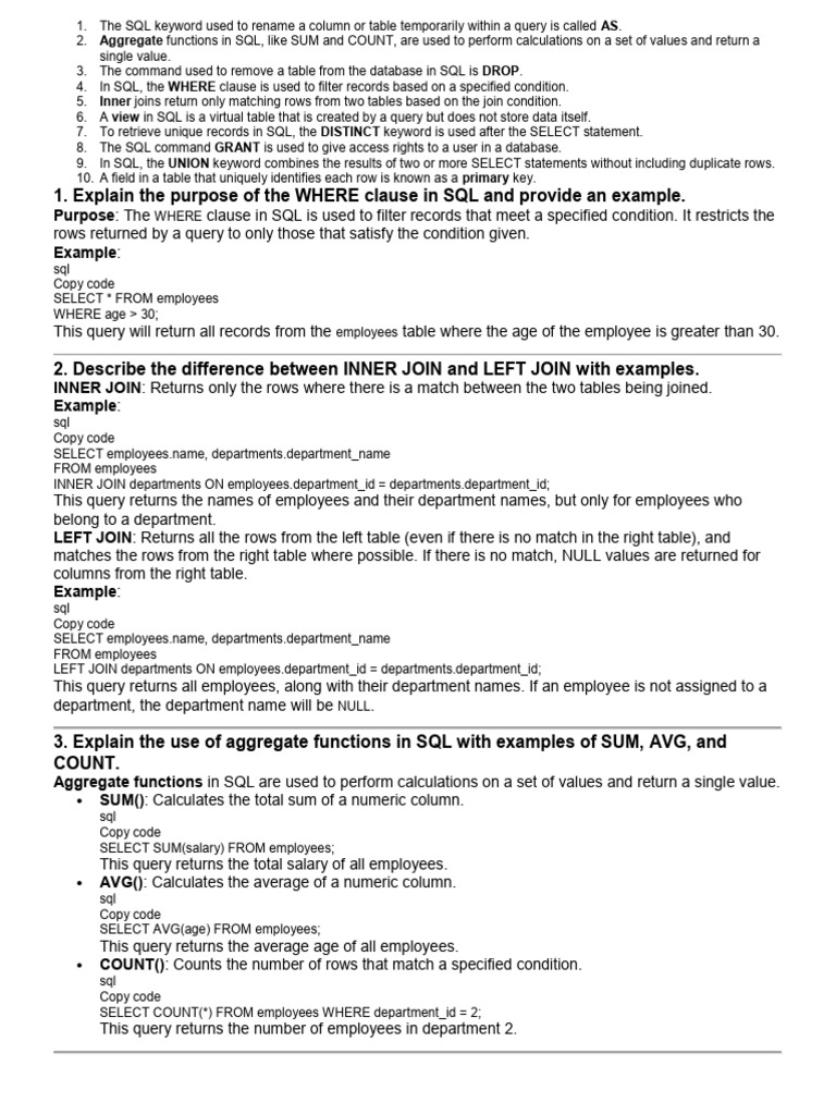 2. Aggregate functions in SQL, like SUM and COUNT, are used to perform calculations on a set of values and return a