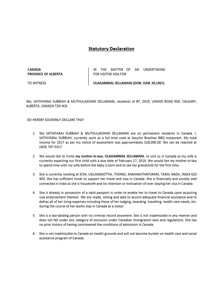 1. We SATHIYARAJ SUBBIAH & MUTHULAKSHMI SELLAMANI are on permanent residents in Canada. I,