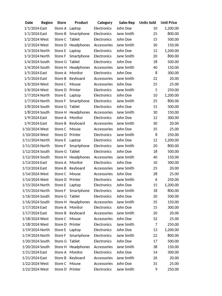 Date Region Store Product Category Sales Rep Units Sold Unit Price